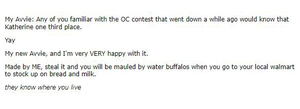 oh ok well i guess i dont have much constructive criticism for other sites since i can just go to my own and do what i want dshagjkg like i accept that presenting myself in an isolated environment such as my own site is going to afford me more freedom than socializing with others through ANY interface, whether online or irl